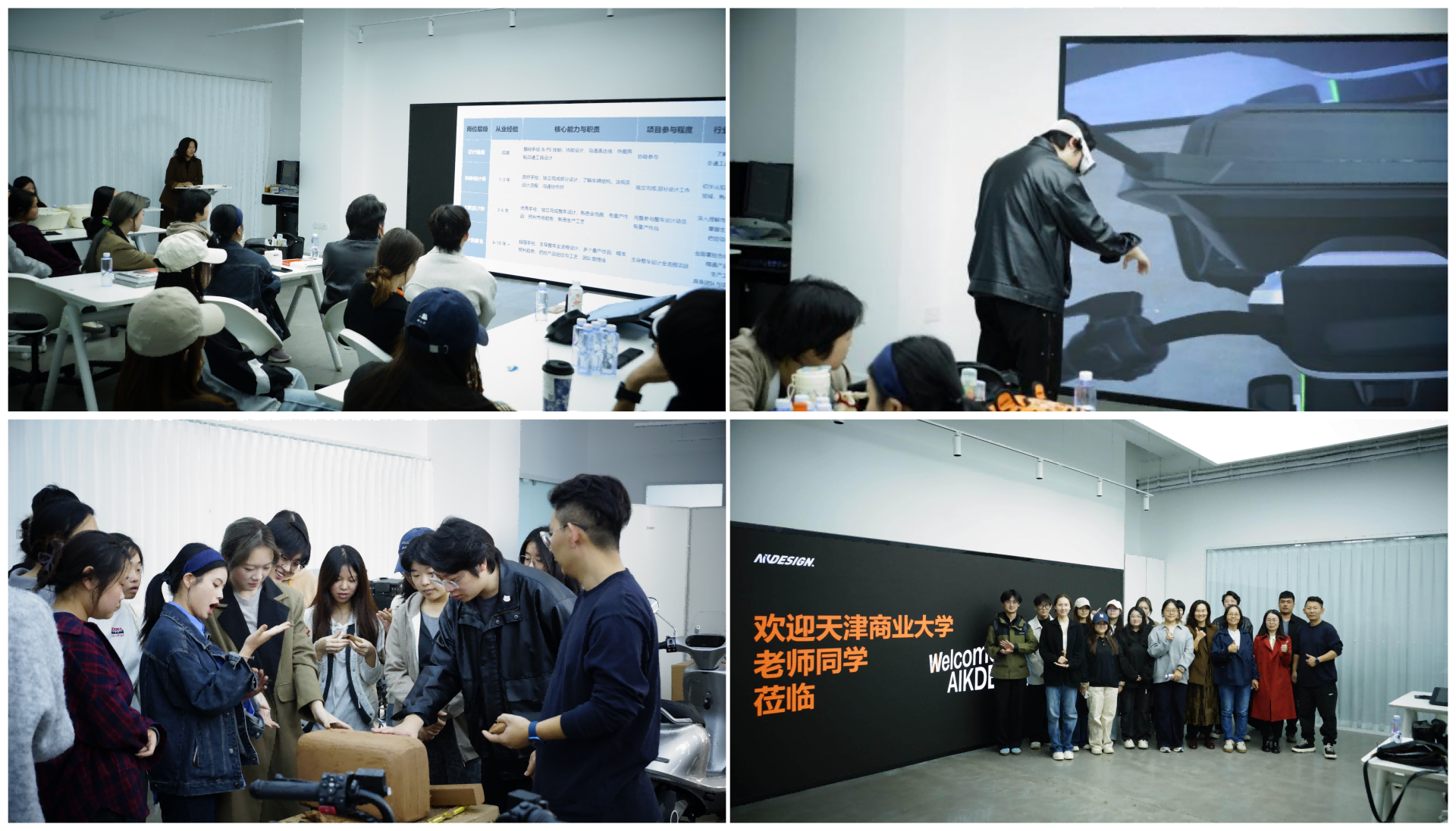 活动伊始,爱客设计总设计师带领师生参观公司工作环境,深入产品设计全流程,从概念构思到3D建模系统讲解,并参观摩托车设计案例及样品陈列展示;随后,师生体验油泥模型制作环节,感受模型制作工艺;VR虚拟现实技术体验则让师生沉浸式理解数字化设计的创新逻辑。活动最后,人力资源部部长介绍招聘岗位及职业发展路径,并设置现场面试环节,为学生求职提供便利。院企双方达成共识,未来将围绕课程建设开展深度合作,共同探索“产学研用”一体化人才培养模式。