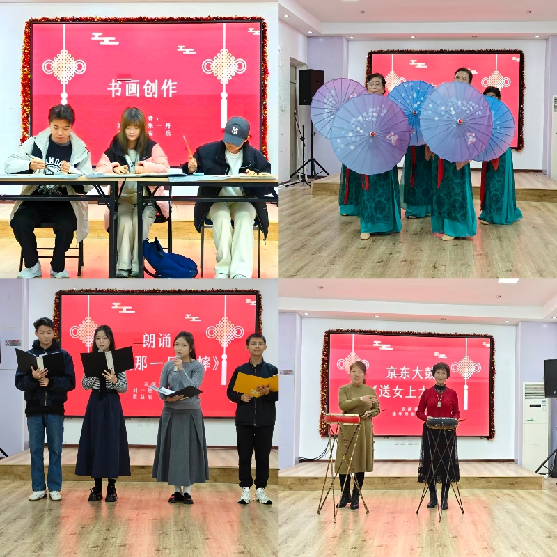 活动现场,社区老人与青年学生同台献艺,联袂呈现了一场情意交融、形式多样的文艺演出。歌声嘹亮,舞姿翩跹:《苹果香》《套马杆》以昂扬旋律点燃全场,尽显青春风采;古典舞《探窗》轻舒曼转,一颦一步间尽显东方韵致;诗朗诵《就是那一只蟋蟀》声情并茂,引人入胜。此外,书画创作笔墨酣畅,魔术表演趣味十足;京东大鼓铿锵有力,戏曲唱段婉转动听,三句半表演更是节奏明快、诙谐生动。一个个精彩节目轮番上演,不断将现场气氛推向高潮,赢得阵阵掌声与喝彩。