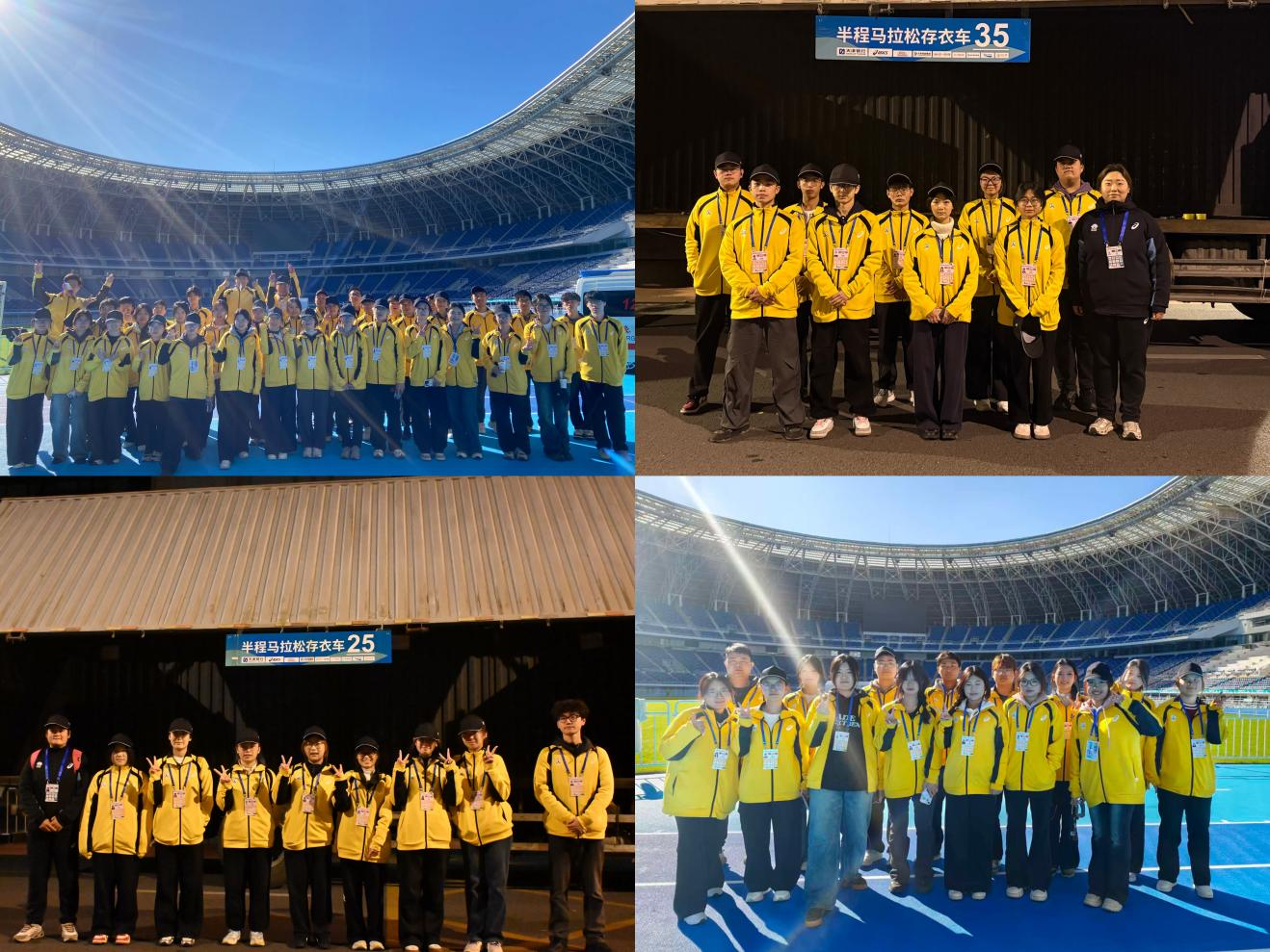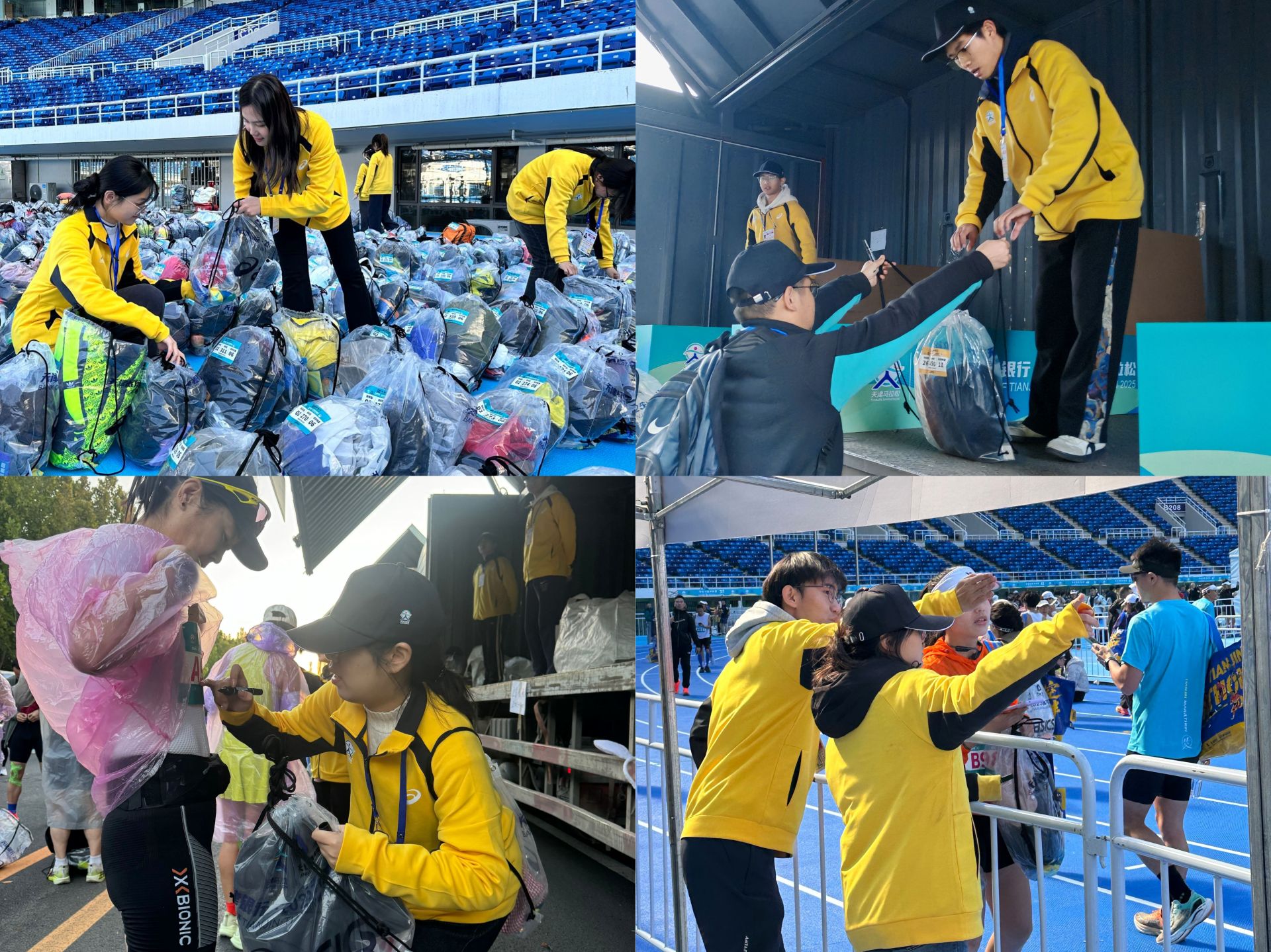 此次马拉松,天商志愿者们的主要工作为全程与半程马拉松的取衣卸货、存取衣、终点计时钟、计时毯操作、直播协助及赛事评估协助等。从黎明到日暮,志愿者们相互协作、默契配合,用热情和周到为参赛者提供了最及时、最贴心的服务,一抹抹“志愿黄”用热忱与用心为这场体育盛会注入了青春动能,成为赛场最温暖坚定的护航力量。