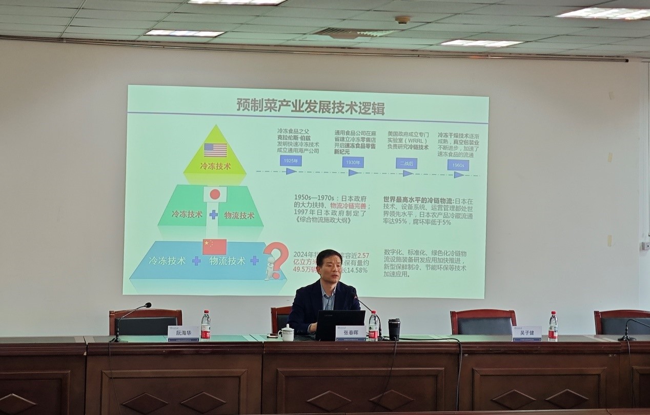 张春晖研究员系统梳理了预制菜产业的发展脉络,深入阐释了预制菜的“前世今生”,并对比分析了国内外预制食品产业的发展路径。重点介绍了其团队在锁鲜技术领域的多项创新成果,包括“冻眠锁鲜技术”“电场辅助冻眠锁鲜技术”以及“肉类食材无晶深冷锁鲜技术”等行业内领先技术,并结合团队在全国多地的调研与产业化实践,给予参会教师和学生以专业的启迪和思考。在互动环节,师生们就课题申报,预制菜营养保留、文化认同等话题踊跃提问,张春晖研究员细致解答。