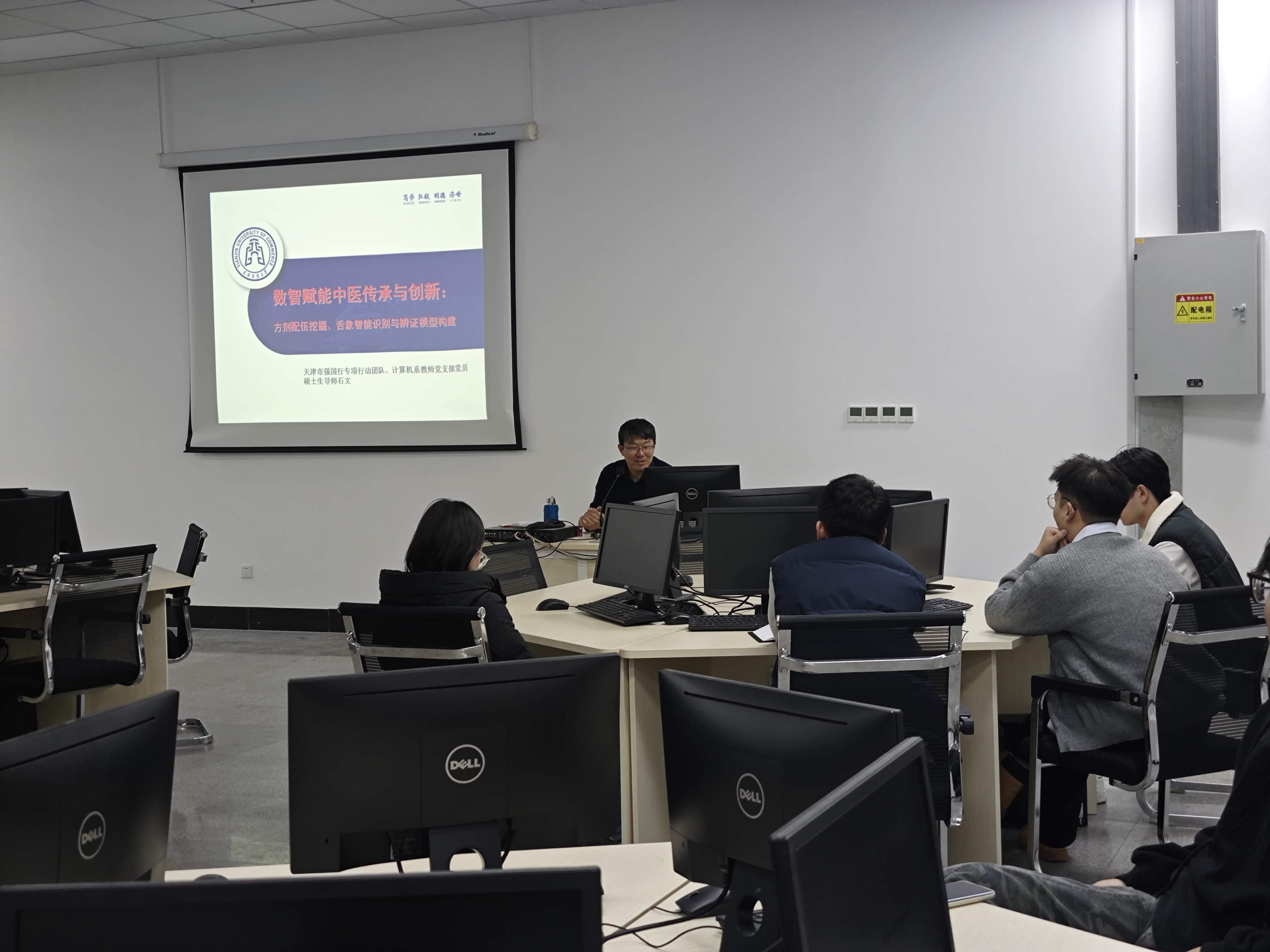 随后开展了案例分享环节,学院天津市“双带头人”教师党支部书记“强国行”专项行动团队成员、计算机系教师党支部党员石文副教授以“数智赋能中医传承与创新:方剂配伍挖掘、舌象智能识别与辨证模型构建”为题,结合具体科研项目,深入解析了数智技术在具体研究领域的创新应用,为研究生开展研究提供了新思路与新方法。