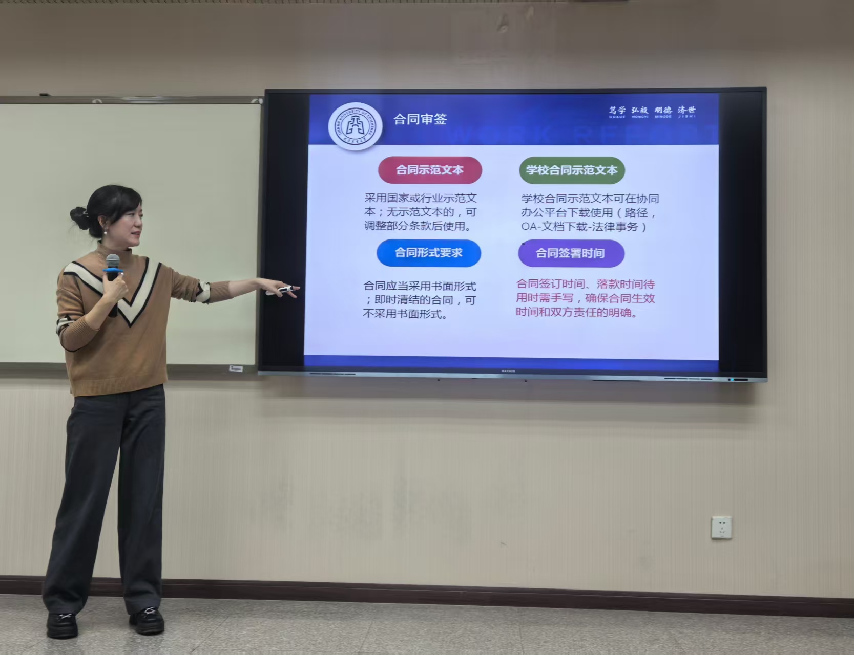 吕姝洁系统介绍了beat365官网依法治校的制度框架与运行机制,结合工作实际,对合同审签的核心流程、关键节点与常见风险进行了细致剖析,通过典型案例提示合规审查与风险防范的实操要点。强调合同审签不仅是必要的管理程序,更是教师保护自身、规范履职的重要屏障,引导大家从入职之初就筑牢法治根基、恪守契约精神,将“依法执教、规范履职”内化为自觉的职业操守。