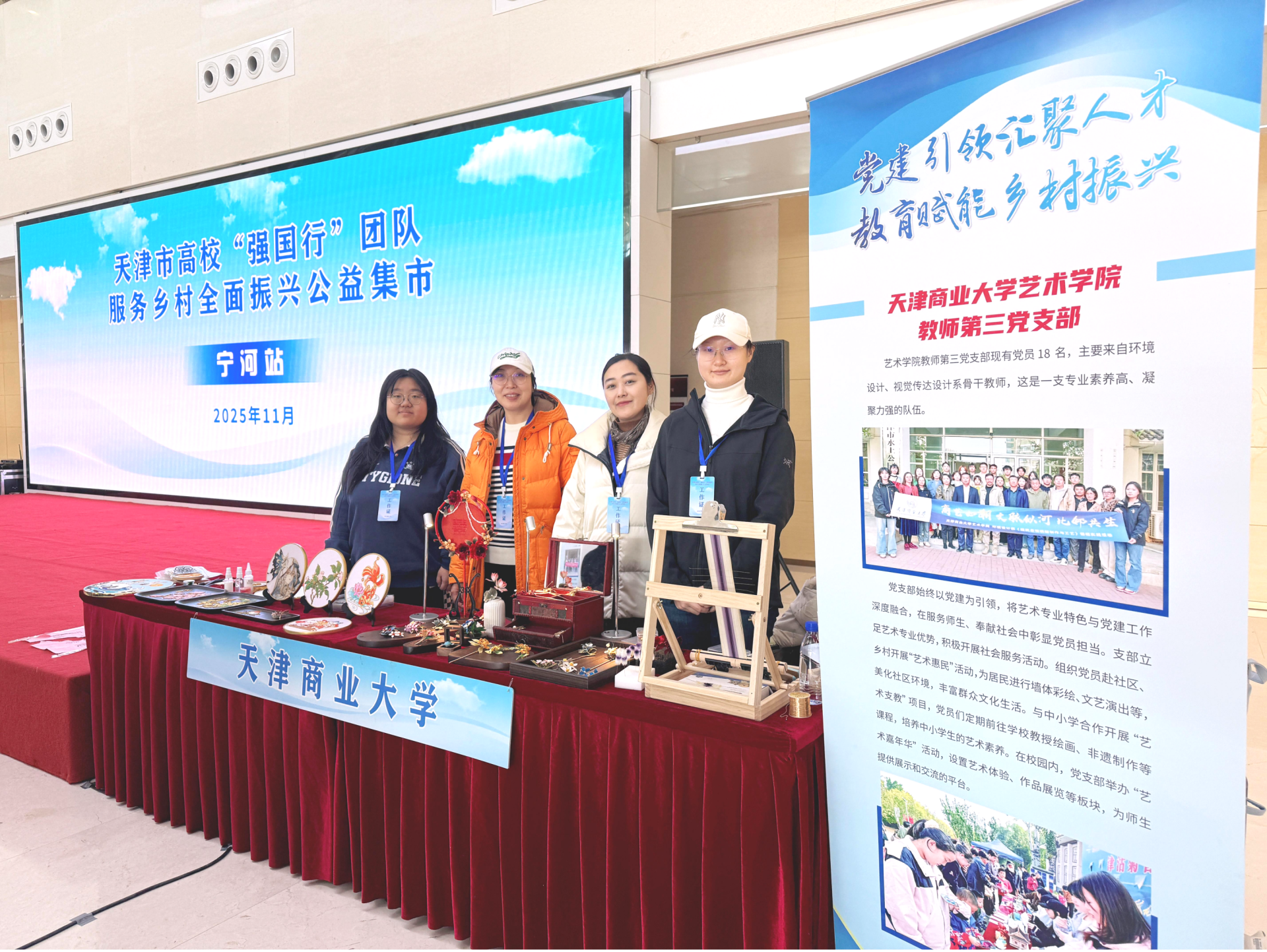 11月27日,艺术学院教师第三党支部团队赴宁河区参加天津市高校“强国行”团队服务乡村全面振兴系列活动开幕式暨公益集市·宁河站活动。本次活动坚持党建引领,聚才引智,为乡村振兴注入源头活水;发挥教育优势,授人以渔,为地方发展赋能增效。