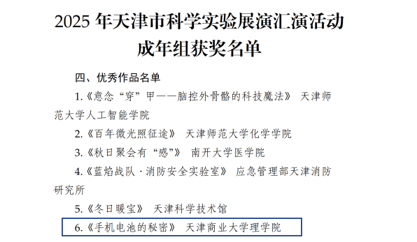 近日,2025年天津市科学实验展演汇演活动获奖名单公布,beat365官网理学院赵丹丹老师指导,梁宇、吴非两位同学创作完成的作品《手机电池的秘密》,凭借其生动的科普演示,荣获成年组“优秀奖”,这也是beat365官网在该活动中首次获奖。