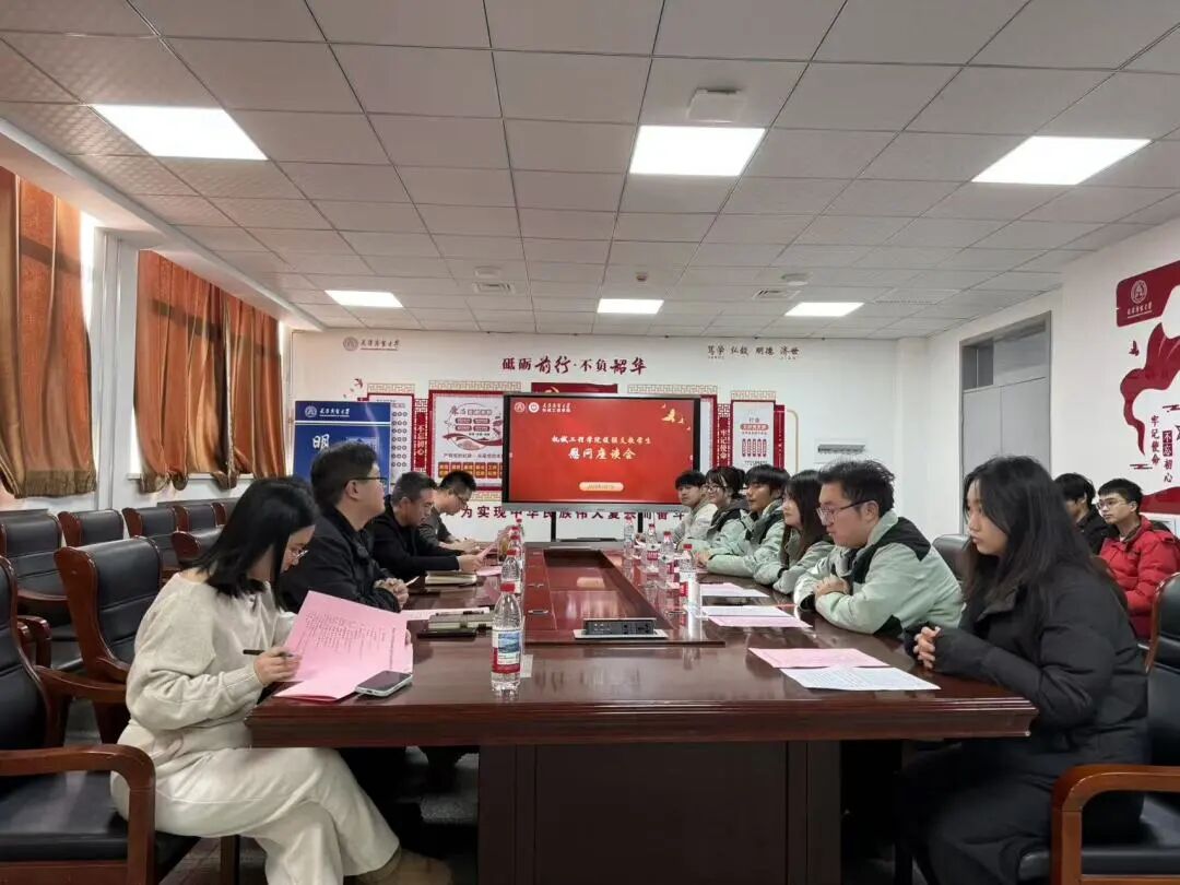 1月7日上午,机械工程学院在1号实验楼513会议室召开援疆支教学生慰问座谈会。学院党委书记张莹、院长刘圣春、党委副书记王凯出席,援疆支教学生索锦姝、张晓燕、丁煜宸、杨轶,辅导员苗敬臣、孙雅以及学院爱心支教队代表参加座谈。