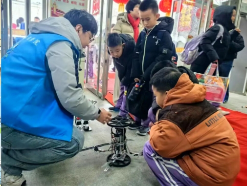 活动现场,志愿者们充分发挥专业优势,详细讲解不同机器人的功能及应用场景,重点介绍了搜救机器人和两栖巡检机器人在危险救援、环境巡检中的作用,帮助小学生了解到如何依靠科技守护安全。机器狗灵活完成奔跑、跳跃、作揖等动作,仿生蝴蝶机器人模拟真实飞行姿态,跳舞机器人跟着音乐节拍完成连贯动作。志愿者指导学生通过手机控制机器狗,耐心解答学生提出的各类问题,分享自身在大学期间学习科技知识、参与创新实践的感悟,引导孩子们主动思考、热爱科学。