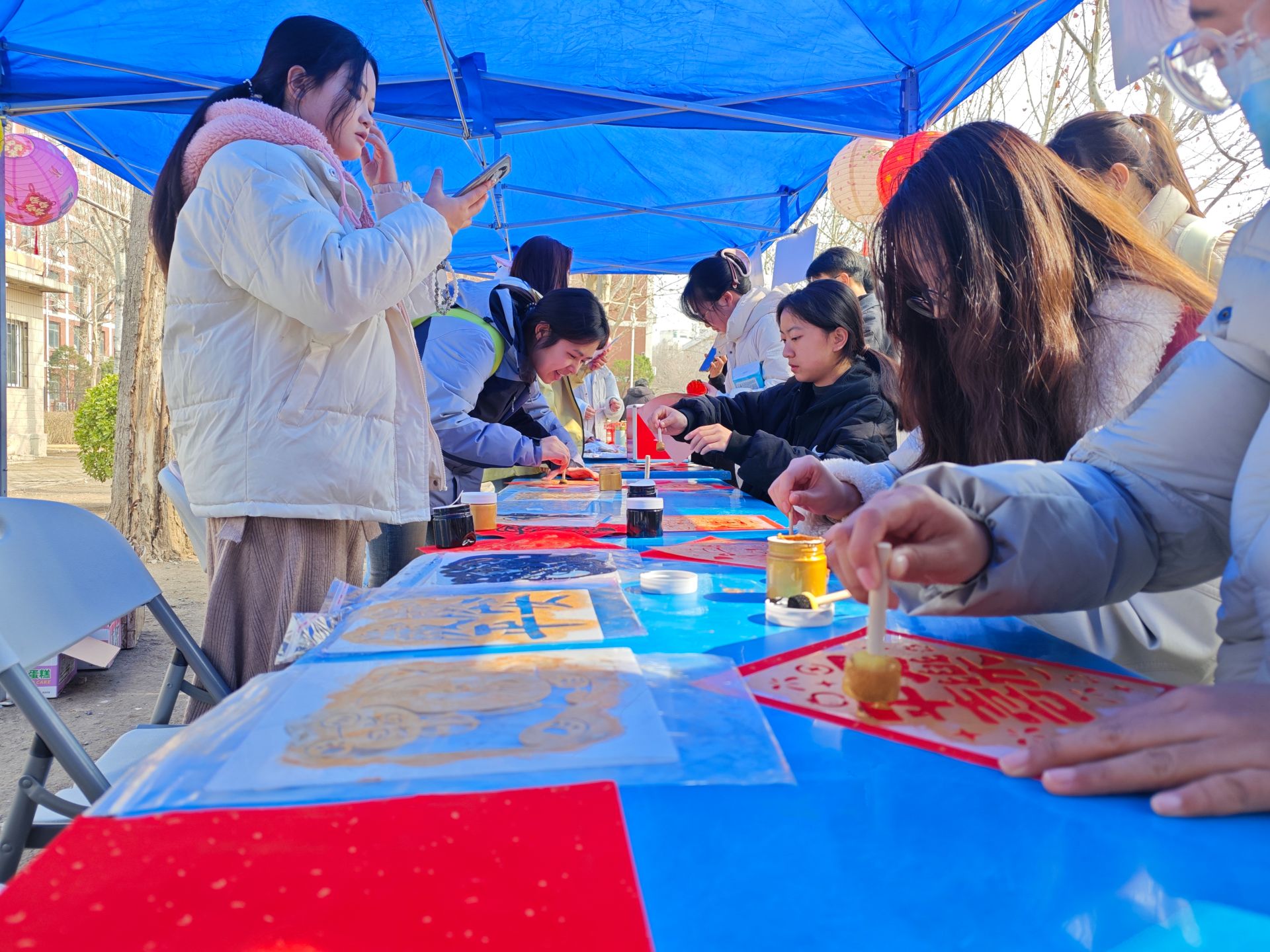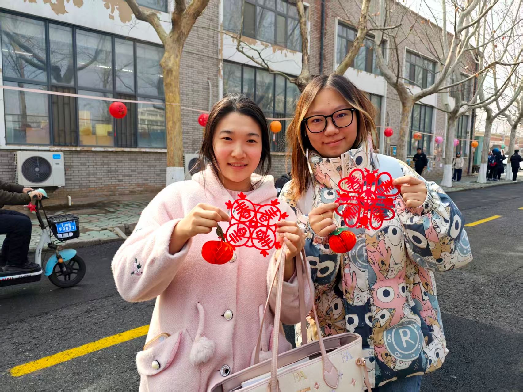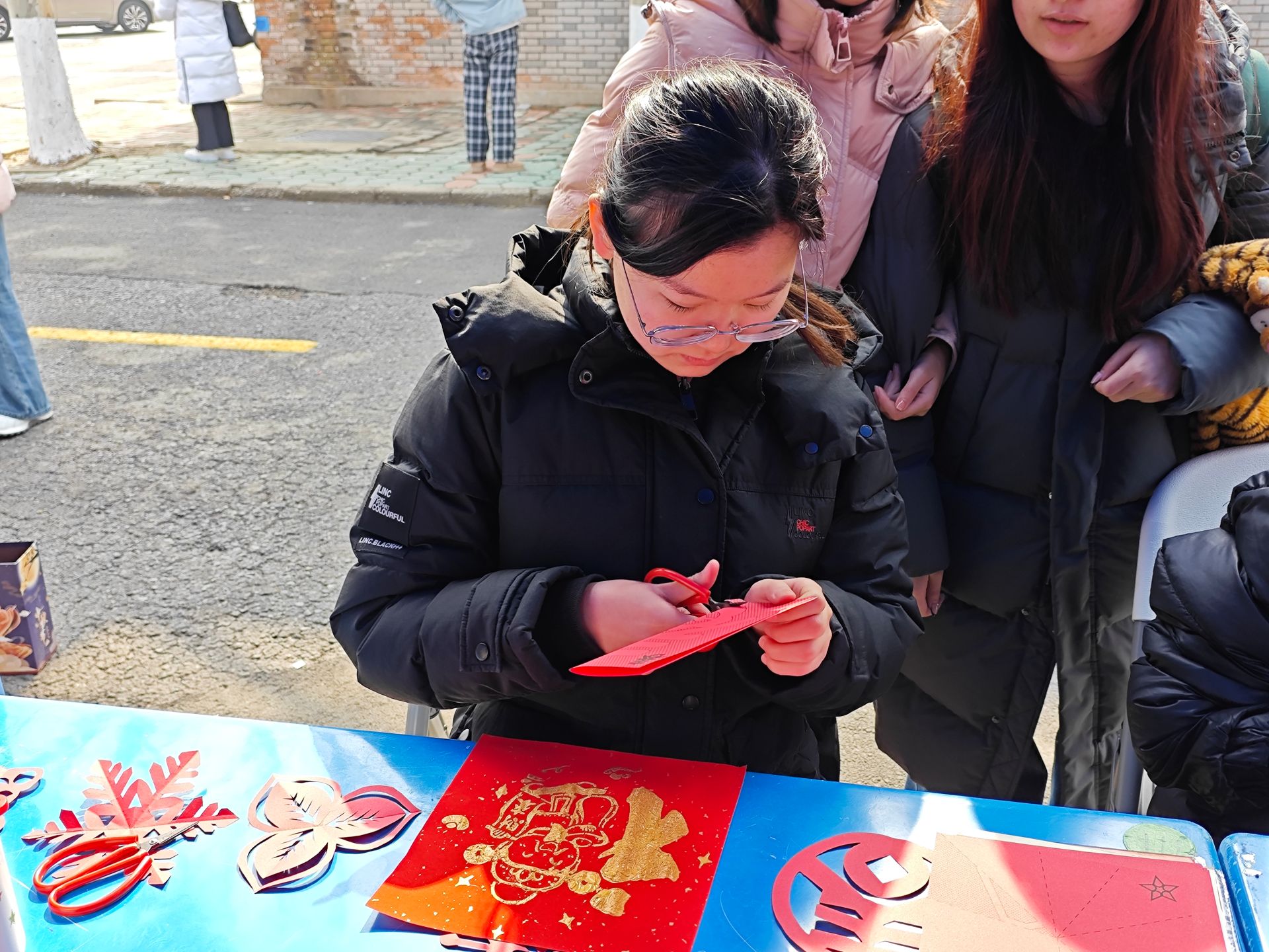 活动现场,“灯谜”“拓印”“剪纸”“投壶”“扭扭棒”五大主题体验区各具特色,让师生沉浸式感受传统文化的深厚底蕴。在趣味猜灯谜区,同学们精心布置的灯谜长廊挂满了五彩灯笼,古今字谜与趣味谜题交织,同学们驻足思索、踊跃竞猜,猜对即可参与抽奖,兑换暖心元宵好礼,现场不时传来答对谜题的欢呼声。新春拓印体验区里,大家亲手按压模型福字,将墨香与祝福拓印在红纸上,把满满福气与传统韵味带回宿舍。元宵剪纸工坊中,师生们用剪刀在红纸上勾勒出喜庆纹样,指尖流转间,非遗技艺的精妙与魅力尽显。投壶雅趣挑战区大家瞄准、投掷,在传统游戏中感受闲情雅致,挑战成功的师生还收获了元宵主题小礼品。扭扭棒创意手作区更是充满巧思,同学们用多彩扭扭棒DIY出可爱的元宵造型,发挥奇思妙想,收获了独一无二的手作快乐与专属纪念。