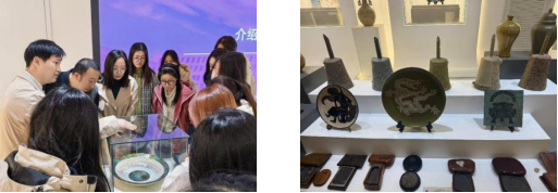 踏入研究中心,仿佛置身于一座中华传统器物的艺术宝库。陶瓷的温润古朴、木器的自然雅致、漆器的绚丽精美,每一件器物都承载着厚重的文化底蕴与匠人的心血和智慧。师生们驻足观赏,细细品味,从器物的造型设计到纹饰图案,从材质肌理的独特质感到制作工艺的繁复精巧,都让师生惊叹不已。