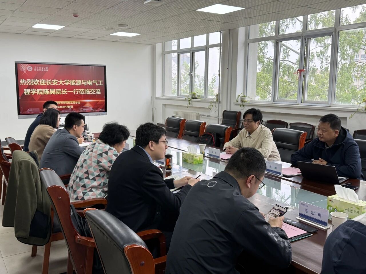 4月9日上午,长安大学能源与电气工程学院院长陈昊、能源与动力工程系主任张鹏一行到访机械工程学院开展交流座谈。学院党委书记张莹,副院长刘冰、常青,制冷与低温工程系副主任付海玲,青年教师王志明、郭浩,辅导员陈勇参加活动。
