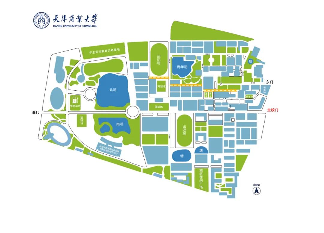 道路贯穿主校门至西门,在西门南北方向延伸,途经图书馆、南北湖、国际教育交流中心、冷链物流设施技术创新与职业能力提升中心、体育馆、学生劳动教育实践基地(天商农场)等区域。