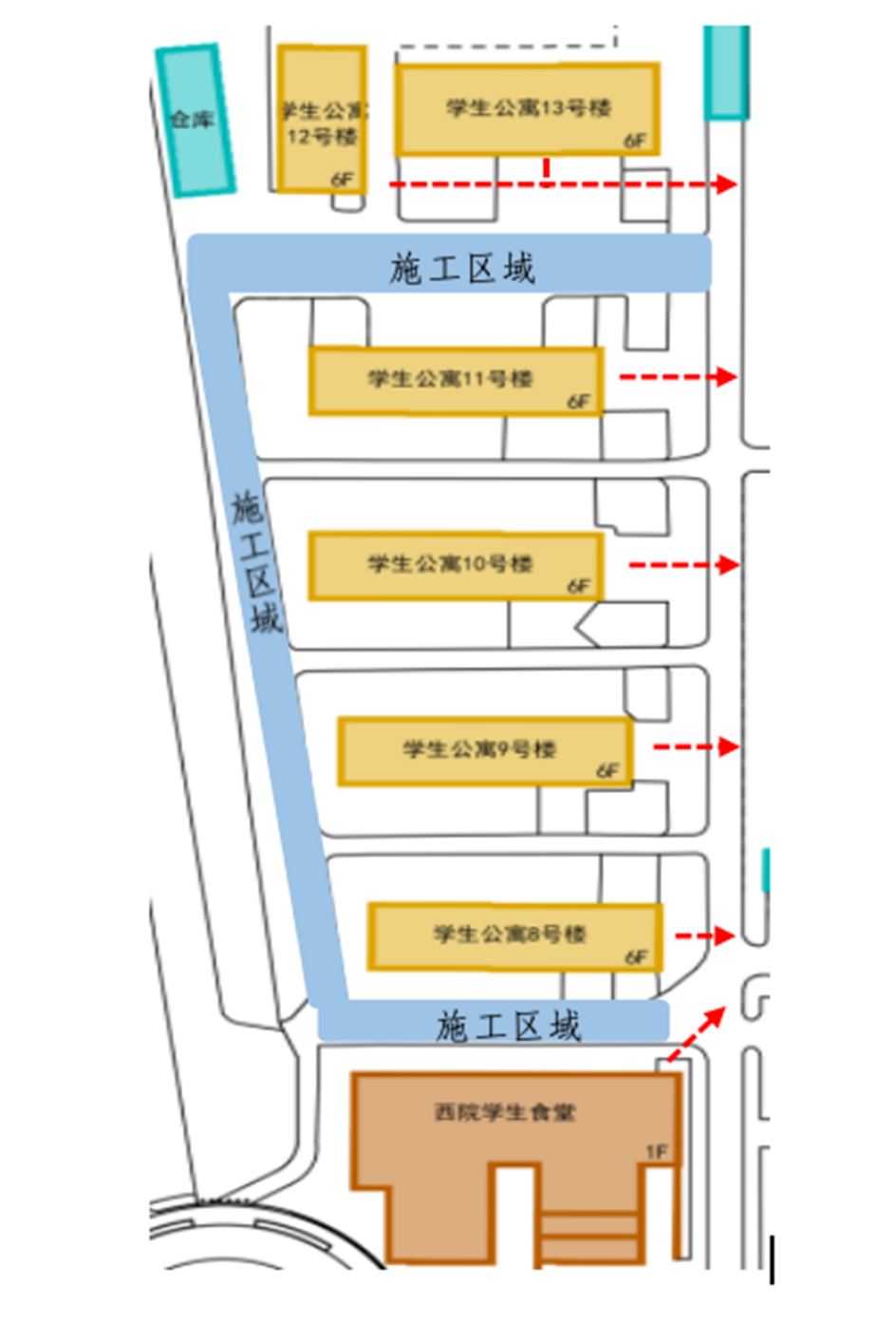 西区8-13号学生宿舍楼间道路施工封闭区域及学生出行路线示意如下图所示: