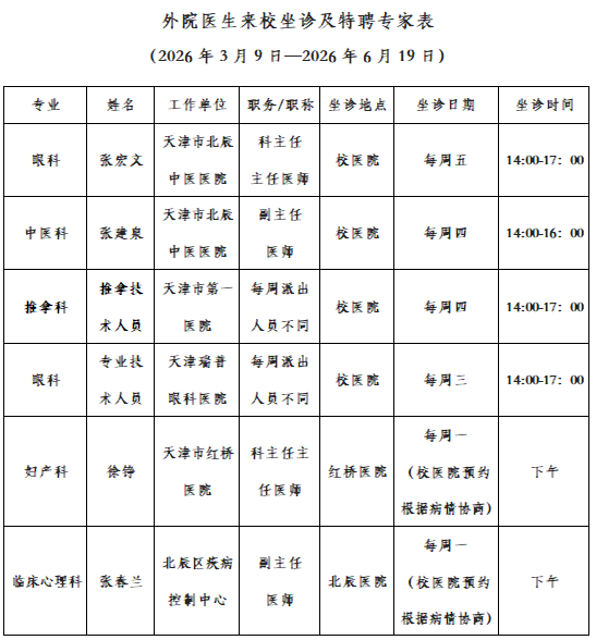 诊疗时间:2026年3月9日—2026年6月19日,每周五14:00-16:00