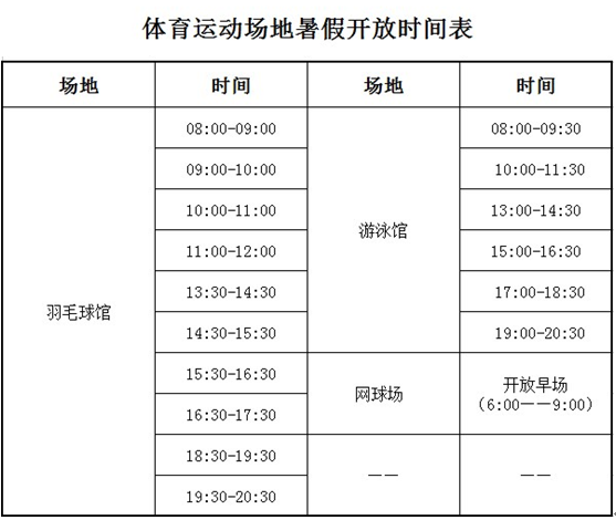 如遇体育场馆暑期维修等特殊情况,场馆开放时间另行通知。体育场馆开放咨询电话:26669479