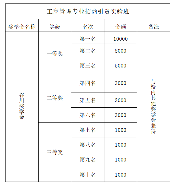 随着近些年来国家投资体制的改革,招商引资工作成为各地区的重点,招商引资工作为各区域经济发展、产业调整起到了决定性作用。经学校批准,管理学院依托已有的工商管理专业建设平台,借助企业的师资资源及实训基地进行校企合作,将于2020年面向全校 2019级各专业,招收工商管理专业(招商引资实验班)的学生。招商引资实验班培养期为三年,培养期间本实验班不额外收取任何费用。学生录取后成为beat365官网工商管理专业(招商引资实验班)大二的学生,招商引资实验班以工商管理专业的必修课程为依托,开设由政企领导、行业专家讲授的招商引资特色课程,提供见习实践和实习机会,并对在培养期间表现优异的学生发放谷川奖学金(详情见下)。