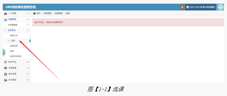 首先进入【选课管理】,可以看到左测的选课菜单,点击【选课】。如【图1-1】。