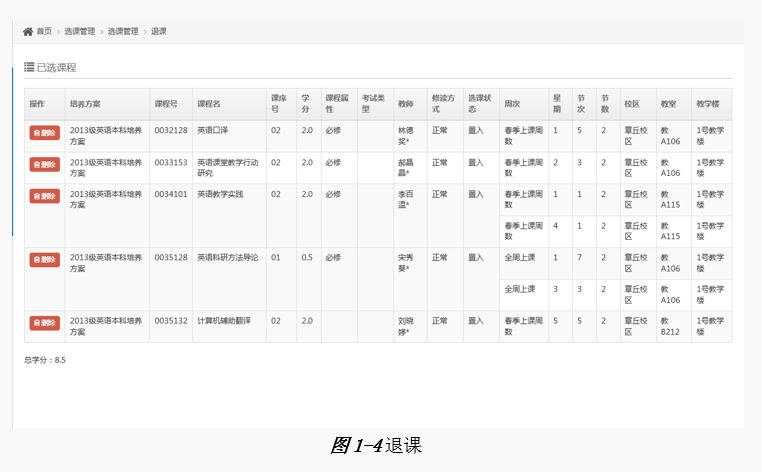进入【退课】页面,学生可对已选择的课程进行删除操作,注意不可删除已置入的必修课。