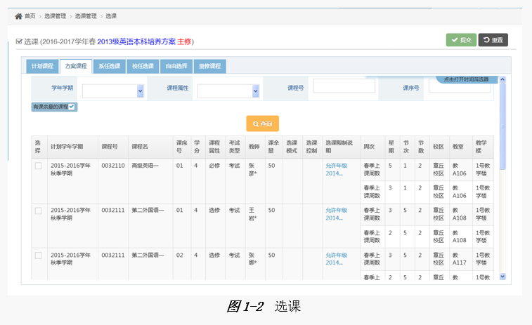 学生选择自己的专业培养方案后,选【方案课程】即可进行相应的选课操作,如【图1-2】。