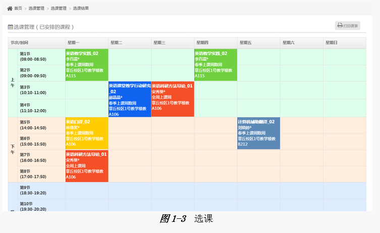 补退选结束后,学生可自行上网浏览、核对、打印自己的课程表,并按课表上的时间安排上课。