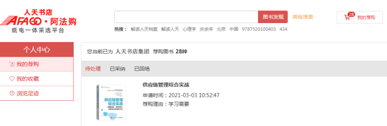 4、我的荐购:【个人中心】→【我的荐购】 中可查看到所有的荐购书目,及图书馆的采纳情况。