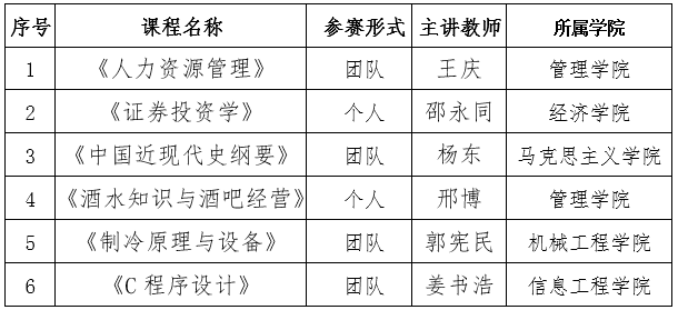 经过网络评审和现场评审,学校最终确定推荐《人力资源管理》等六个课程组(个人)参加首届全国高校教师教学创新大赛天津赛区比赛(以下简称市赛),现将具体信息公示如下: