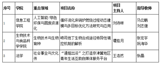 经各学院(部门)初评推荐,学校“大学生创新创业训练计划”项目专家组复评,择优推荐以下3项“大学生创新创业训练计划”项目参加天津市“国创计划”重点支持领域项目的评选。现将项目评审结果进行公示:
