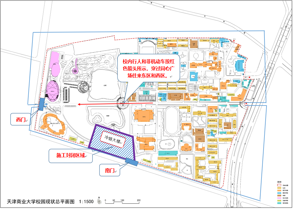 3.校内行人和非机动车辆可从图书馆前大道经同心广场通行。