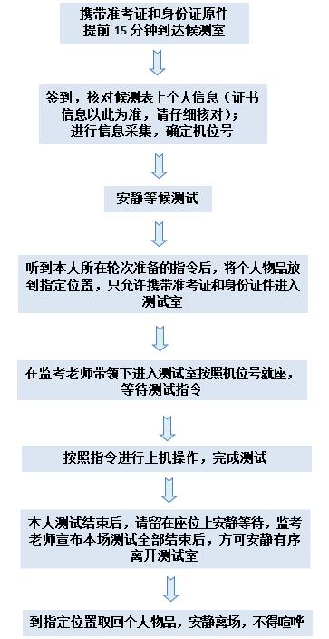 1.请持本人身份证原件和准考证参加测试,如准考证个人信息有误,请务必在测试当天到候测室进行更正。