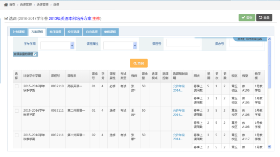 学生选择自己的专业培养方案后,选【方案课程】即可进行相应的选课操作,如【图1-2】。