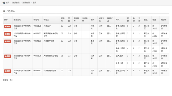 进入【退课】页面,学生可对已选择的课程进行删除操作,注意不可删除已置入的必修课。
