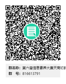 为及时获取比赛相关信息,请参赛选手加入第六届信息素养大赛天商初赛QQ群(QQ群号码:816613791)。