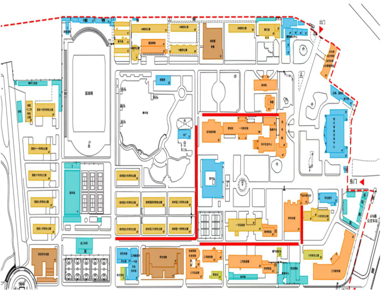 4.四号教学楼、一号教学楼北侧直至学术交流中心。