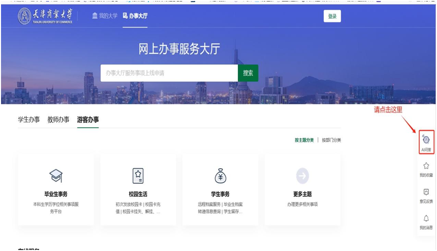 目前“天商百事通”已成功对接到企业微信和网上办事服务大厅中,师生可以通过上述两种途径进行访问使用,具体使用方式如下: