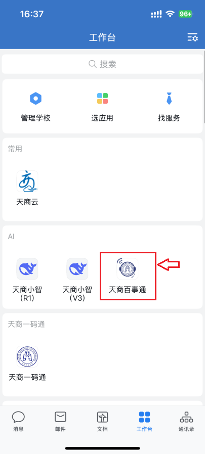 1.移动端访问方式:点击“企业微信”-“工作台”-“天商百事通”,如下图所示: