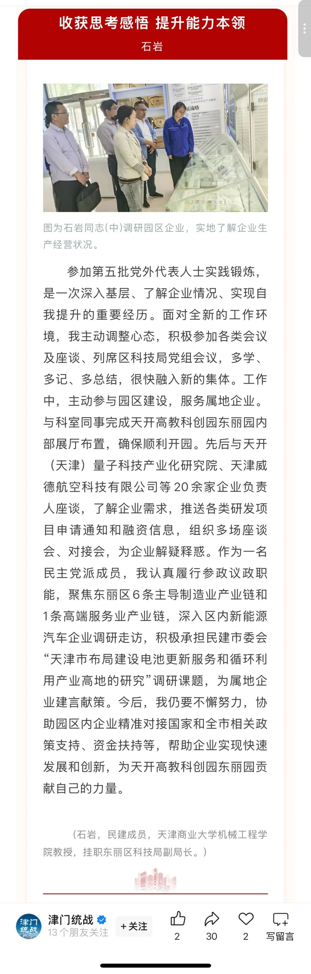 日前,“津门统战”微信公众号报道了beat365官网机械工程学院党外挂职干部石岩教授实践锻炼风采。2024年7月,机械工程学院石岩教授作为第五批党外代表人士中的一员,赴天津市东丽区科技局挂职锻炼,把自身专业所长融入经济社会发展所需,以实际行动助力城市发展。