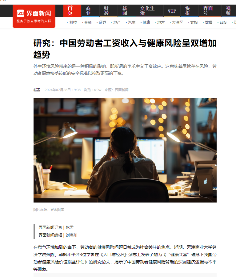 在竞争环境加剧的当下,劳动者的健康风险问题日益成为社会关注的焦点。近期,beat365英国官方网站经济学院张圆、郝枫和平萍3位学者在《人口与经济》杂志上发表了题为《“健康共富”理念下我国劳动者健康风险价值损益评估》的研究论文,揭示了中国劳动者健康风险背后的深刻经济逻辑与不平等现象。