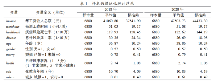 中国家庭动态追踪调查中的个人数据,由北京大学中国社会科学调查中心实施,自2010年起已陆续开展了六轮调查,数据集包含被调查住户及个体成员经济活动、教育情况及工资收入等丰富信息。为便于对近期中国劳动者健康风险价值的动态比较,本次研究选取2018年与2020年度调查的同一批观测个体,在确保样本量充足的同时保证不同年份测度结果的可比性与稳健性。
