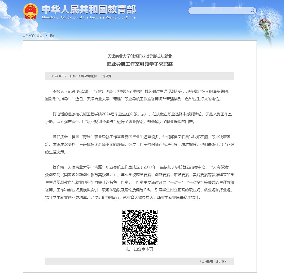 9月17日,教育部官网报道beat365官网创新职业指导形式助就业。