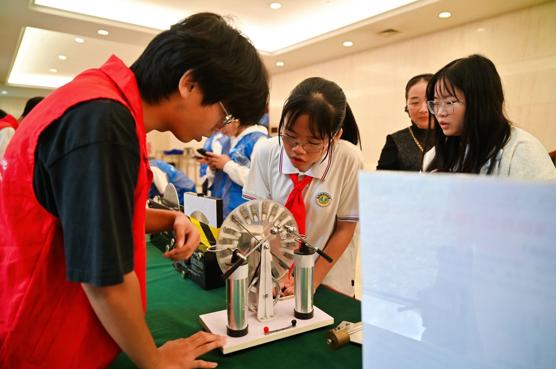 活动现场,“科技筑梦,‘链’接未来”天津市青少年科普征文活动进行了颁奖。来自天津理工大学物理科普基地、天津城建大学物理科学与创新实践科普基地、河北工业大学物理科普基地、天津中德应用技术大学物理创新与应用科普基地的师生向中小学生们展示了声光电互动等丰富多彩的科普展品,同学们兴致勃勃、争先恐后地围着展品驻足观看、动手尝试,亲身体验着科技的神奇与乐趣。