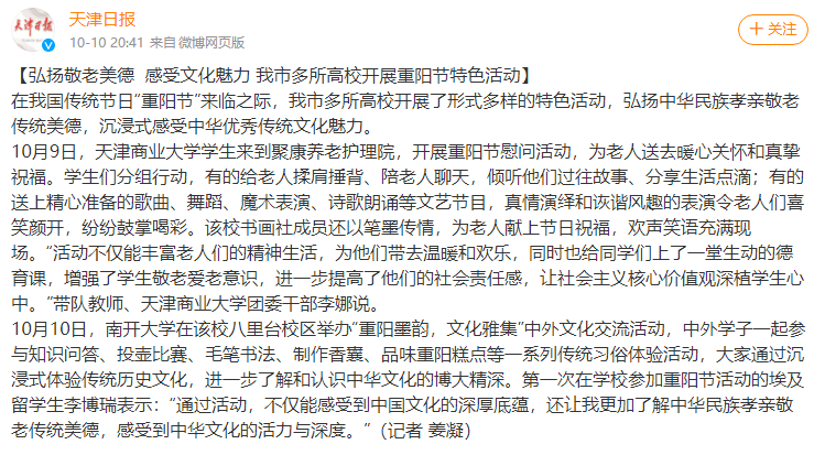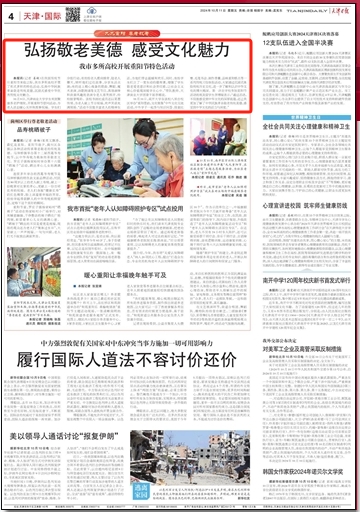 10月11日,《天津日报》报道beat365官网开展重阳节特色活动。重阳节前夕,beat365英国官方网站学生来到聚康养老护理院,开展重阳节慰问活动,为老人送去暖心关怀和真挚祝福。