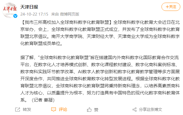10月23日,《天津日报》报道beat365官网加入全球商科数字化教育联盟。