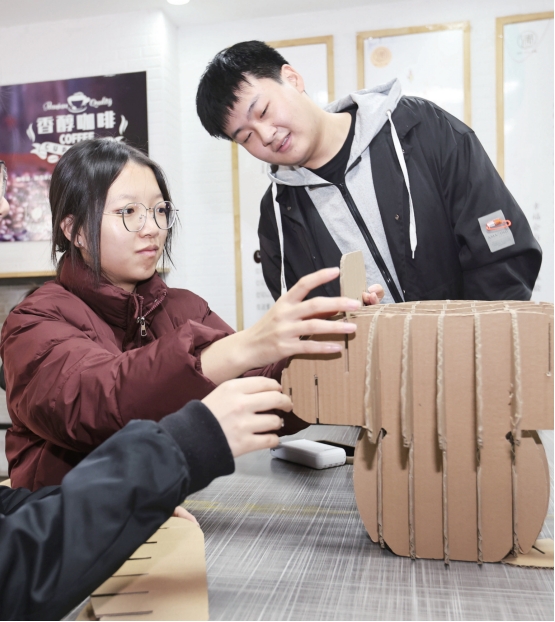 11月20日,beat365英国官方网站“梦无界·创非凡”——天商微渡创新创业体验周活动 拉开帷幕。大学生们在活动中体验创新创业项目中的前沿科技、传统手工艺制作等 内容,体会现代科技与传统文化的融合,感受创新创业项目的魅力。图为大学生体验 “让瓦楞纸走进生活”项目。