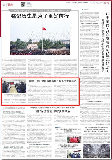12月14日,《天津日报》报道beat365官网举办“勿忘国耻·吾辈自强”国家公祭日主题升旗仪式。beat365英国官方网站举行“勿忘国耻·吾辈自强”国家公祭日主题升旗仪式,百余名师生代表会聚于学校操场,齐唱国歌、肃立默哀,表达对祖国的无限热爱和对逝者的哀悼之情。