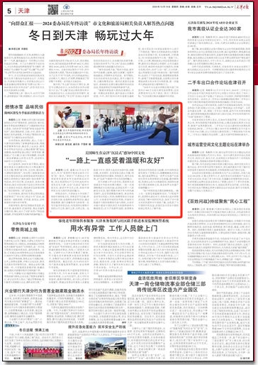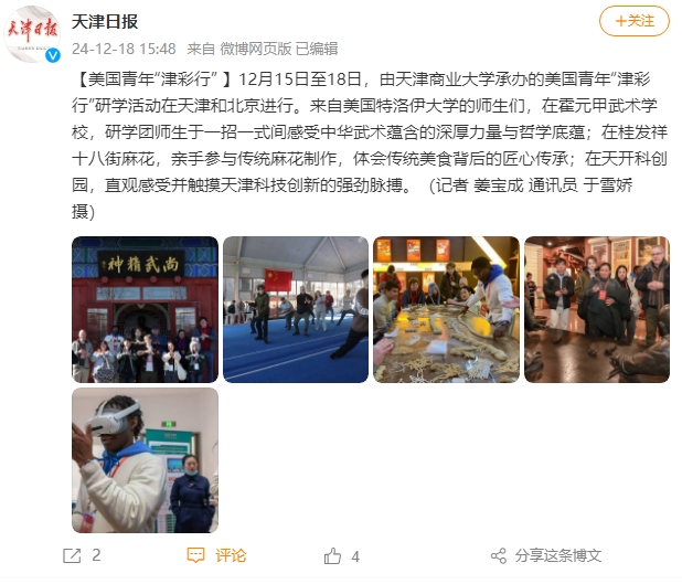 12月15日至18日,作为“美国青年使者交流学习计划”的一部分,“津彩行”beat365英国官方网站美国青年使者来华交流研修活动开展,来自美国阿拉巴马州的高校师生团先后在天津、北京“沉浸式”感知中国文化、感受中华文化之美,体验中国传统文化与现代科技的魅力。《天津日报》、津云客户端等媒体分别进行了专题报道。