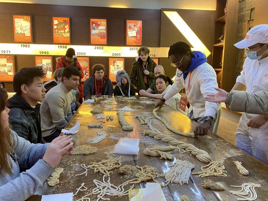 百年老字号企业“桂发祥”十八街麻花文化馆则是以“食”会友,馆内诱人的美食展品、详实的麻花制作工艺令美国青年们目不暇接。在亲身体验麻花制作环节,交流团成员从最初的生疏逐渐变得得心应手,当看到自己亲手搓制出的麻花形状,喜悦与成就感溢于言表,不时发出阵阵欢呼。
