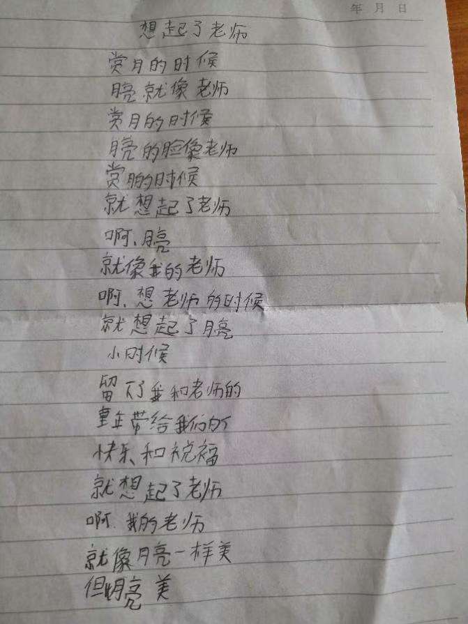 临别时,小奇奇为狄佩佩老师送上了一首深情的诗:“赏月的时候,就想起了老师,老师的脸像月亮……”这些简单却满含深情的话语,深深打动了所有人。这封信也曾在天津市规划展览馆“一个都不能少——天津脱贫攻坚成就展”中展出。