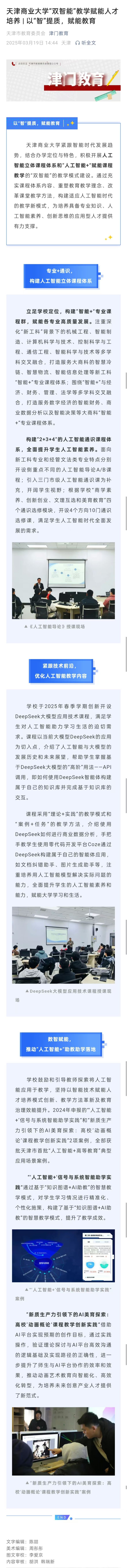 3月19日,津门教育微信公众号报道学校“双智能”教学赋能人才培养。学校紧跟智能时代发展趋势,结合办学定位与特色,积极开展人工智能立体课程体系和“人工智能+”赋能课程教学的“双智能”的教学模式建设。通过充实课程体系内容、重塑教育教学理念、改革课堂教学方法,构建适应人工智能时代的教学新模式,为培养具备专业知识、人工智能素养、创新思维的应用型人才提供有力支撑。