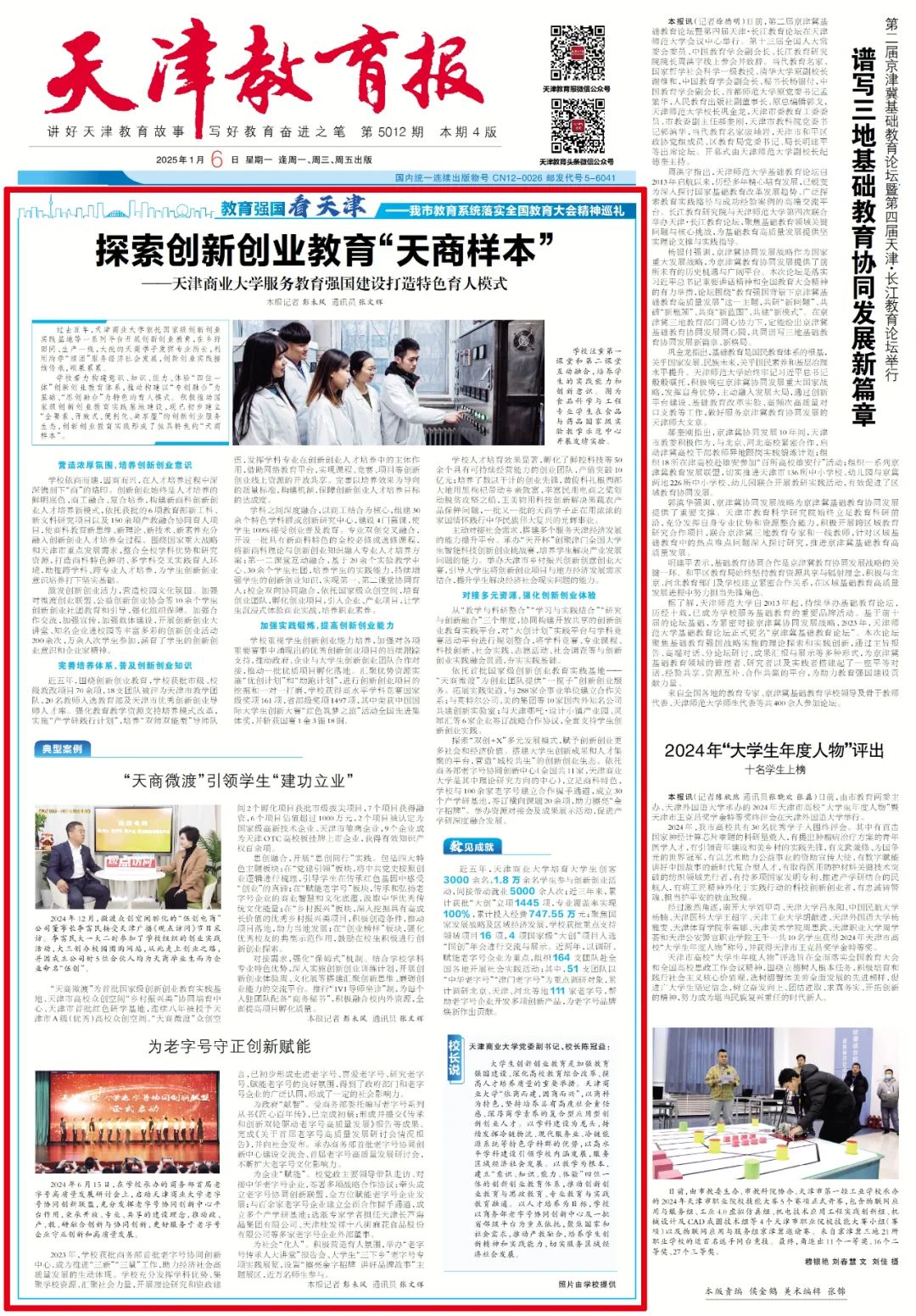 1月6日,《天津教育报》报道beat365官网服务教育强国建设打造特色育人模式。学校着力构建意识、知识、能力、体验“四位一体”创新创业教育体系,推动构建以“专创融合”为基础、“思创融合”为特色的育人模式。积极推动国家级创新创业教育实践基地建设,现已初步建立“全要素、开放式、便利化、共享型”的创新创业服务生态,创新创业教育实践形成了独具特色的“天商样本”。同期,学习强国、《天津教育报》头条号也进行了转载报道。