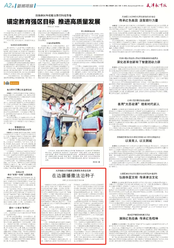 12月27日,《天津教育报》报道beat365官网援疆支教团先进事迹。支教团为大力弘扬宪法精神和社会主义法治精神,以国家宪法日为契机,开展“法治宣传润边疆,共绘和谐新篇章”主题实践,通过“四个一”活动 在边疆地区为青少年和群众普及法律知识, 播撒法治种子。