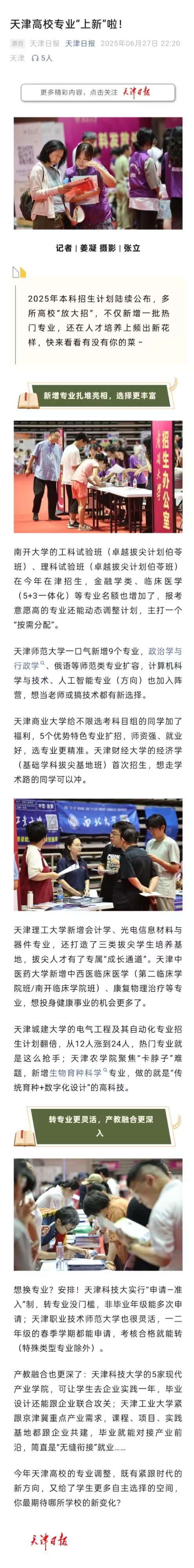 本报讯(记者 姜凝)连日来,我市各高校相继公布2025年本科招生计划,并举办高招咨询及校园开放日活动。据了解,多所高校在今年招生计划、招生专业特点、人才培养模式等方面频现创新,可为学子提供更广阔的发展平台。