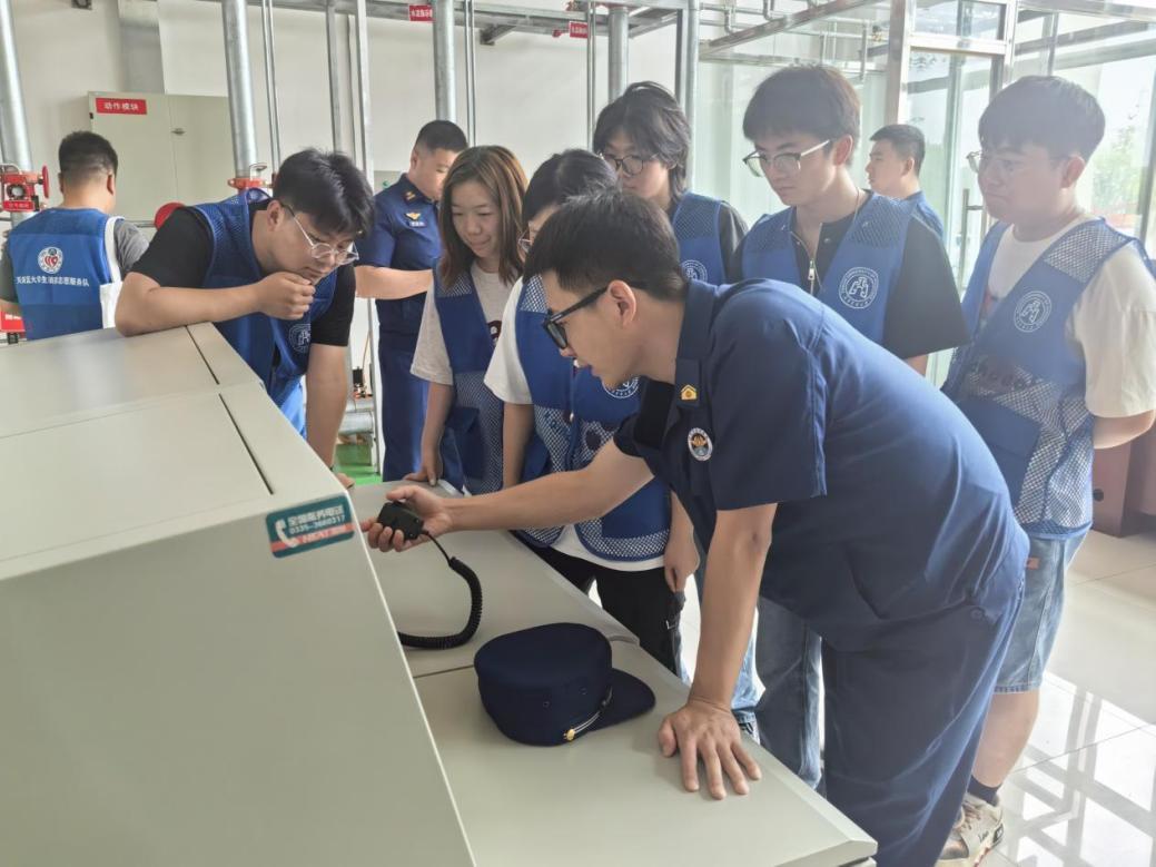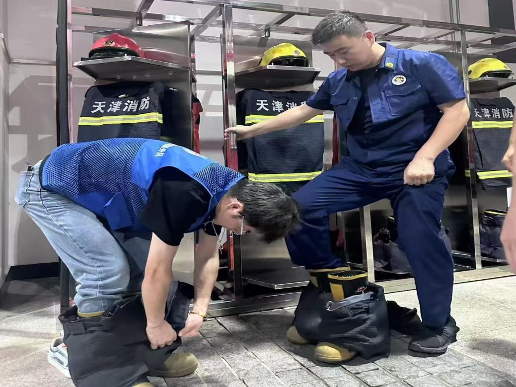 “沉浸式”消防应急体验。在北辰区消防救援支队教育基地,“天商蓝”消防安全社会实践团在消防员的指导下开启“沉浸式”体验活动,与消防员一同开展穿消防服、爬梯训练、通道救援、疏散逃生等基础训练,全过程体验火情出警及救援。同时,团队成员还近距离参观各类消防车辆及破拆工具等专业设备,深入学习了用电安全隐患排查、校园火灾预防、扑救初期火灾和逃生自救等知识。
